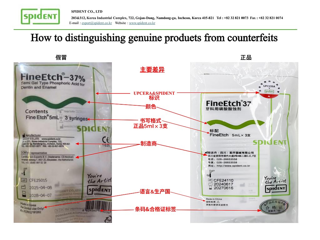 近來,我們發現市場上存在涉嫌銷售假冒斯派丹FineEtch牙科用磷酸酸蝕等產品的行為。這些假冒產品來源不明,質量無法保證,為臨床工作埋下隱患,重則可能危及患者健康安全。